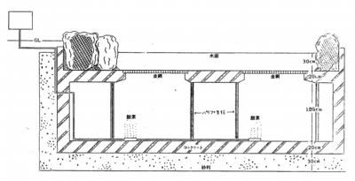 北海道のような寒冷地の池は冬に10~15cmの氷が張るので池に魚を飼う場合、池の深さは1.5m必要であるが、氷雪のない時期は子供が転落する危険があったり、池底を泳ぐ魚を鑑賞することができなくなるなどの問題点があった。これに対処するため、腐食防止の亜鉛メッキをした金網を水面から30cmほど下に張り、魚を網の上で泳がせることによって危険防止とともに魚を鑑賞することも十分可能になった。この施工を行った際には水中にコンクリートから出るアクを抑えるビニボン塗料を塗り、水中ポンプで上部にある滝の水を流すことで魚のために酵素を池に取り込む工夫をした。