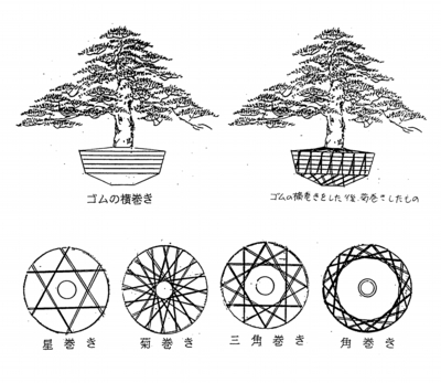 前ページに示すようにタイヤチューブを螺旋状に切り、庭木の根の横巻きを利用している。昔から根巻きの方法の型は決まっていて、種類は上記に示すとおり三角巻き、角巻き、星巻き、菊巻きなどがある。樹種、移植方法、土壌などによってこれらを使い分けるが、同じ敷地内で移植をする場合は星巻き、クレーントラックによって樹木を移動する場合は菊巻きを使用する。